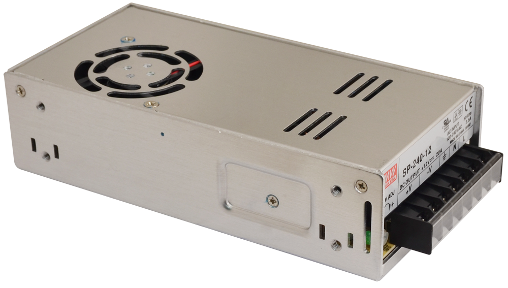 Napájecí zdroj, výstup 12 V / 20 A * Vhodný pro napájení analogových i HD kamer * Rozměry 190 x 93 x 50 mm * Hmotnost: 800 g * Chlazení ventilátorem s regulací otáček dle teploty * Optická signalizace LED * Rozsah regulace výstupního napětí: 10 V - 14 V * Výstupy: svorkovnice (2 x V+, 2 x V-) * Napájení: AC 88 V - 264 V, 50 Hz * Ochrany: zkrat (SCP), nadměrný odběr (OLP), přehřátí (OTP), přepětí (OVP) * Vysoká účinnost 86% * Materiál: železo, antikorozní úprava, barva stříbrná *