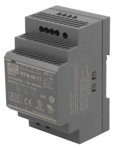 * Napájecí zdroj na DIN lištu, výstup 12 V / 4.5 A * Volitelný výstup napětí 10.3 - 14.3 V * Provozní teplota - 30 až 70°C * Rozměry 50 x 90 x 55 mm (Š x V x H) * Hmotnost 190 g * Možnost instalace na DIN lištu 35 mm * Rozsah vstupního napětí 85 - 264 V, AC 47 - 63 Hz * LED indikace provozu * Ochrana proti zkratu a přetížení * 2x výstupní šroubovací svorkovnice *