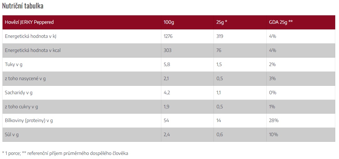 Jerky Beef (hovězí) Peppered 25 gSkladem 12 ks62 Kč/ ks55 Kč bez DPH